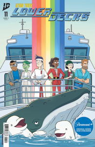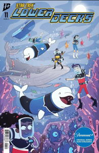 Solicitation: Sqeak, squaw, sssskkkaaa, eh, eee. [Translation: Cetacean Ops here! Matt and I have brought the crew of the U.S.S. Cerritos back to the year 1987 for a top-secret mission of great import.] HHHkkkeeeeee, ska, ska, EeeEEAaa. Squaw, squaw. Click, cliiiiick [Translation: That's right, Kimolu. We need their help to fix what that blowhole Kirk messed up by bringing the whales George, Gracie, and Ronald to Earth without a way for them to repopulate its oceans. What was Ronald supposed to do, have babies with his mother?] Skkkesaw. Eehhh, ee, ee, AaaaaAa. AH, AH, EeeEE! Sqqqqaw. [Translation: But the remaining humpbacks have all heard freaky conspiracy theories about what happened to the last pod who went to Earth. To save the species, the Lower Deckers will have to dissuade them of the rumors and convince them Earth is worth inhabiting. Ah=yikes.] This issue kicks off the penultimate arc of this season's run, so be sure to order whale ahead of time!